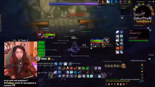 02:32:42Im Stream geht es um das Bewältigen von Quests im Dämmerwald, insbesondere eine, die der Host abgeben muss. Sie erkundet die Spielwelt, um die relevanten Fragezeichen auf der Karte zu finden. Dabei diskutiert sie ihre Talente und Fähigkeiten, insbesondere 'Wilder Biss', der für bestimmte Gegner wie Roboter in der Gnome-Regan-Instanz essentiell ist, da diese nicht bluten. Sie ist sich unsicher über die Effektivität ihrer Fähigkeiten wie 'Zerfetzen' und erkundigt sich im Chat, um ihre Kombopunkte optimal zu nutzen.