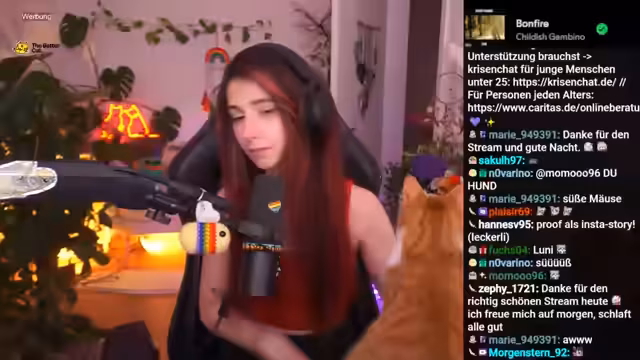 06:55:48Auf Anfrage werden die Bedeutung einiger Tattoos erläutert. Ein Löwe aus König der Löwen symbolisiert die Kindheitsliebe zu diesem Film. Andere Tattoos, wie Feenflügel, wurden primär aus ästhetischen Gründen ohne tiefere symbolische Bedeutung gestochen. Der Stream neigt sich dem Ende zu. Es wird der Versuch unternommen, den Stream abzuschließen, aber die Hauskatzen, insbesondere Ferox, sorgen durch ihr Verhalten für Ablenkung und Unterbrechungen. Die Streamerin bedankt sich bei der Community für die Gesellschaft, kündigt den nächsten Stream für 18 Uhr an und beendet die Sendung nach fast sieben Stunden.