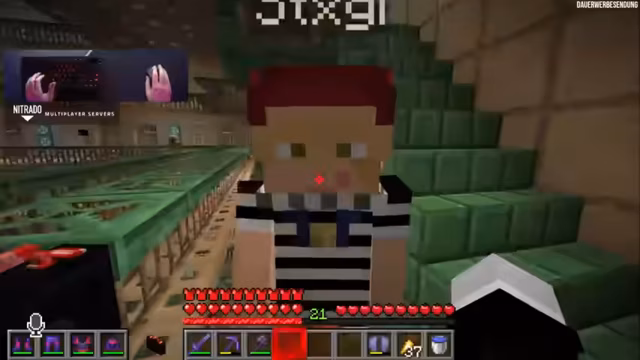 02:01:57Der Streamer konfrontiert Stigi mit dessen wiederholten Verstößen gegen interne Skin-Regeln und verhaftet ihn. Stigi wird aufgefordert, alle seine Items in einen Hopper zu legen, da diese nicht versichert sind. Die Verhaftung dient jedoch einem tieferen Zweck: Stigi soll den neuen Escape Room des Streamers testen. Bevor der Escape Room beginnt, gibt es eine humorvolle Szene, in der Stigi aufgefordert wird, für Fotos zu posieren und seinen Hut abzunehmen. Der Streamer erklärt die Regeln des Escape Rooms, darunter das Verbot, bestimmte Blöcke abzubauen, den Chat auszuschalten und Freecam oder Fullbright zu verwenden. Stigi wird in seine Zelle gebracht, und der Timer für den Escape Room beginnt.