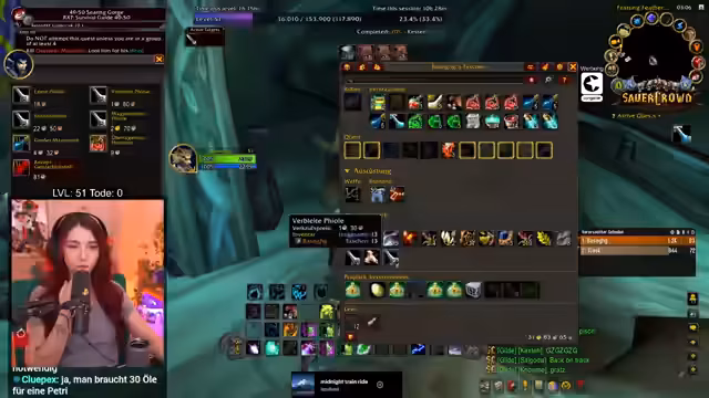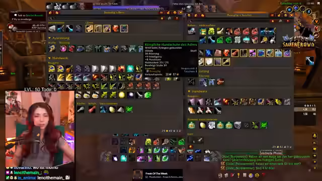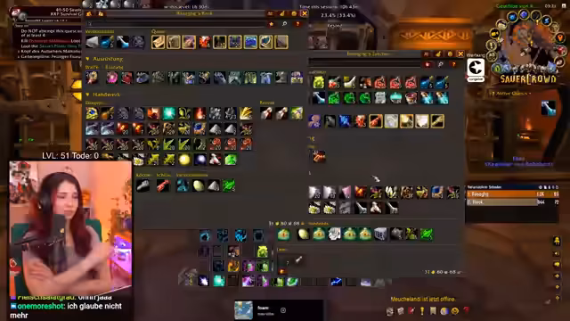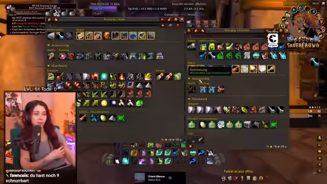 11:16:00Vor dem Stream-Ende kümmert sich der Streamer um die Organisation seines Inventars und seiner Bank. Er sortiert überschüssige Kräuter und Ressourcen aus, um Platz für zukünftige Beute zu schaffen. Dabei wird ihm der hohe Preis für zusätzliche Bankplätze bewusst. Auch das Finden von Gegenständen mit ähnlichen Icons, wie Khadgars Schnurrbart und Herz der Wildnis, stellt ihn vor kleine Herausforderungen bei der Organisation.