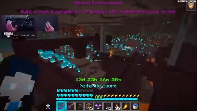 00:10:42Der Fortschritt im Projekt liegt bei noch benötigten 19 Beacons, was 57 Wither-Skeleton-Köpfen entspricht. Die aktive Farm-Strategie besteht darin, schnell zwischen verschiedenen Festungen im Nether zu fliegen, um die Skelette zu jagen. Ein Trank der Feuerresistenz wird als notwendig erachtet, um sicher durch die feuerumgebenen Festungen zu navigieren und die Effektivität der Jagd zu erhöhen.