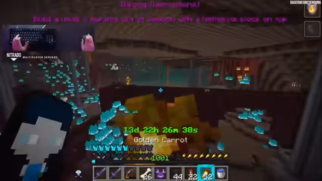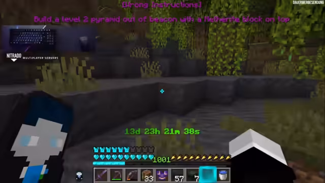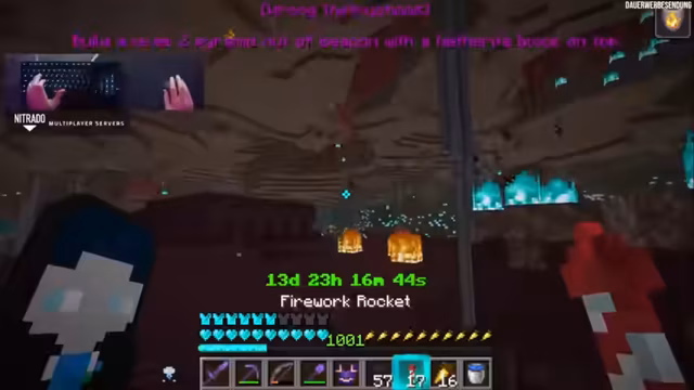 02:37:53Der Fokus lag auf der Ausrüstung. Es wurde diskutiert, wie viele Verzauberungen theoretisch auf eine Elytra passen, nämlich vier: Curse of Binding, Curse of Vanishing, Mending und Unbreaking 3. Alle Wither-Schädel-Köpfe wurden bereits zusammengetragen, um mit dem Kampf bei St. D. zu beginnen. Auf dem Rückweg zur Basis wurden Nachschub an Essen und Raketen benötigt. Geplant war auch ein Besuch an der Creeper-Farm.