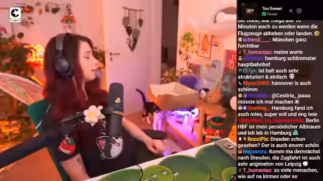 02:47:13Nach vier Tagen auf der Cactus-Messe in Leipzig ist der Streamer wieder zu Hause und berichtet von seinen Erfahrungen. Besonders positiv fielen ihm der gut organisierte und nicht überfüllte Leipziger Hauptbahnhof auf, der direkt an ein Einkaufszentrum angebaut ist. Auch die Fahrt mit der Bahn zurück nach Berlin verlief reibungslos, wobei er im Zugabteil eine nette Dame traf, die Rotwein trank, während er seinen Tee genoss. Zu Hause angekommen, freute er sich besonders, wieder bei seinen Katzen Luna und Ferox zu sein.