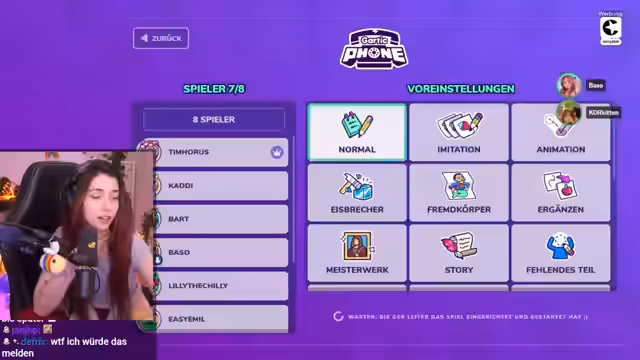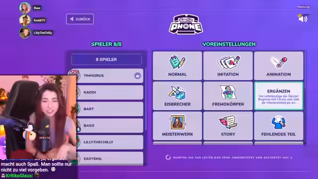 00:24:24Es wird Gartic Phone als Zeichenspiel erklärt, bei dem Prompts geschrieben und gezeichnet werden. Verschiedene Modi und Themen sind geplant, inklusive Vorschläge von Bart. Nach Gartic Phone soll eventuell noch Stadt, Land, Fluss mit lustigen Themen gespielt werden. Es wird scherzhaft angedeutet, dass Timmit an diesem Abend viele Clips generieren wird. Ein kurzer Schlagabtausch zwischen den Geschlechtern entsteht, wobei die Frauen auf einen höheren Zuschaueranteil hoffen. Lilly springt als Ersatz für Leon ein, wird aber als Ehrengast bezeichnet. Die Frage nach dem Link für Gartic Phone kommt auf. Es wird festgestellt, dass niemand im Team wirklich gut zeichnen kann. Es wird spekuliert, ob es sich um die Gartic Phone Version mit zufälliger Werbung handelt. Eine Anekdote über einen Amazon-Paketboten, der den Streamer fälschlicherweise für eine Escort hielt, wird erzählt, was auf rotes Licht im Raum zurückgeführt wird. Die sexy Vibes durch rotes Licht werden thematisiert, aber nur an die Girlies, Gays und Theys gerichtet. Es wird ein Profilbild-Hype im Chat festgestellt.