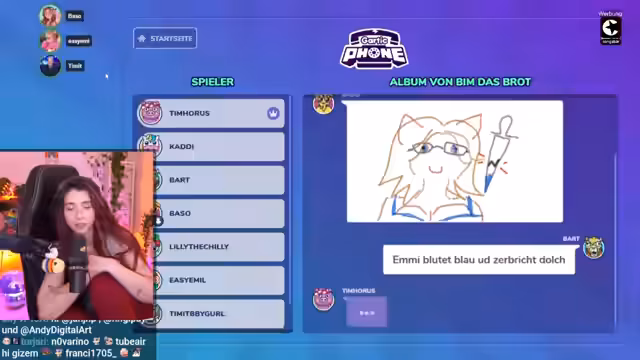 00:33:27Die erste Runde Gartic Phone beginnt im normalen Modus, bei dem entweder geschrieben oder gezeichnet werden muss. Als erstes Thema wird die Lobby selbst gewählt, wobei die Teilnehmer aufgefordert werden, eine Person aus der Runde auszuwählen und etwas dazu zu zeichnen oder zu schreiben. DJ trinkt im Nachtclub wird als Vorschlag genannt. Es wird kurz überlegt, mit dem Stream in einen Club zu gehen, um Männer abzulenken. Einige Teilnehmer haben technische Probleme mit dem Bildschirm oder der Seite, was das Zeichnen erschwert. Die Zeit wird als zu kurz empfunden, besonders bei komplizierten Prompts. Es wird über wackelnde Mauszeiger und deren Auswirkungen auf das Zeichnen geklagt. Trotz der Herausforderungen sind einige Teilnehmer stolz auf ihre Ergebnisse. Es wird über die Augenfarbe von Emi diskutiert. Die Frage, warum jemand 'überraschend gut' in den Chat schreibt, wird humorvoll kommentiert. Es wird festgestellt, dass Emi falsch geschrieben wurde. Die Prompts werden als süß beschrieben, aber Tim beklagt, dass man Leute aus der Gruppe nehmen muss. Die Schwierigkeit, Menschen zu zeichnen, wird thematisiert. Es wird über die Aussprache von Kokos diskutiert. Einige Teilnehmer sind sehr zufrieden mit ihren Meisterwerken, trotz der begrenzten Zeit.