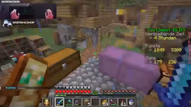 00:26:53BastiGHG kümmert sich um die Bienen und hofft, Monster für ein Achievement mit der Armbrust zu finden. Kevin farmt Holz und legt es in eine Kiste. BastiGHG holt das Holz ab und sucht eine Höhle. Kevin macht sich auf die Suche nach Gunpowder, um Raketen herzustellen. BastiGHG verzaubert seinen Bogen und findet die Verzauberung sehr nützlich. Er fragt nach den Koordinaten der Kiste mit dem Holz. BastiGHG erwähnt, dass er seine Connection geändert hat und hofft, dass es nicht mehr laggt. Er überlegt, sich häufiger auszuloggen, um Sachen zu erledigen. Kevin ist auf dem Server und farmt Holz. BastiGHG sucht nach Monstern und hofft, Achievements zu machen. Kevin legt Holz und eine Schallplatte in die Kiste. BastiGHG fliegt zu einem anderen Dorf, um zu handeln und Sachen für eine Trial Chamber zu besorgen. Er hofft, einen Heavy Core zu bekommen und die Maze Achievements zu machen. Er sucht nach einem Meadow und einer Savanne.