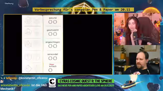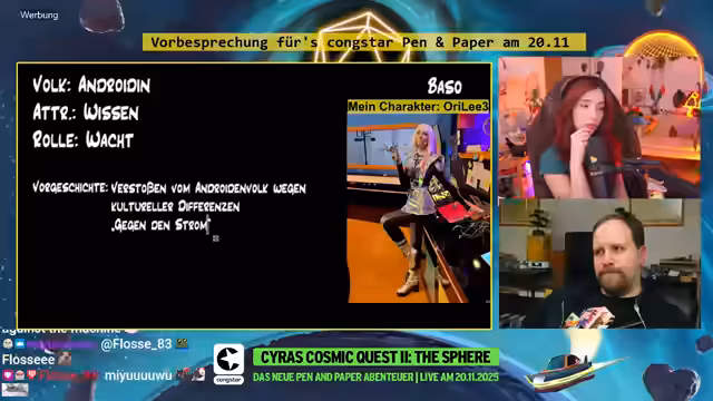 00:33:34baso kündigt das Pen & Paper Event 'Cyro's Cosmic Quest 2: This Fear' für den 20.11. an, das in Kooperation mit dem Stream-Partner Congstar stattfindet. Es ist die Fortsetzung des erfolgreichen Vorjahres-Events, bei dem erneut ein aufwendiges Studio-Set mit speziellen Kulissen und Technik genutzt wird. Baso wird ihren Charakter vom letzten Jahr weiterspielen, neu dabei sind Kaddi und Jen. Das Event wird um 19 Uhr starten und ein Highlight der nächsten Streams sein.