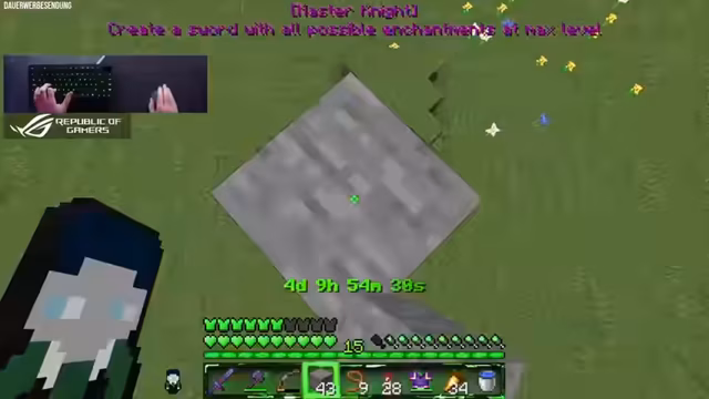 00:40:10Nach erfolgreicher Behebung der technischen Probleme wird das Hauptprojekt des Streams fortgesetzt: das '111 Custom Achievements'-Projekt. Der Streamer befindet sich in Folge 7 und stellt die bisherigen Leistungen vor. Die Hauptaufgabe besteht darin, ein ultimatives Schwert mit allen möglichen Verzauberungen auf maximalen Leveln zu erschaffen. Da Sharpness, Smite und Bane of Arthropods nicht kombinierbar sind, entscheidet er sich für ein Sharpness-Schwert und plant ein zusätzliches Smite-Schwert speziell für das Farmen von Wither-Skeletten.