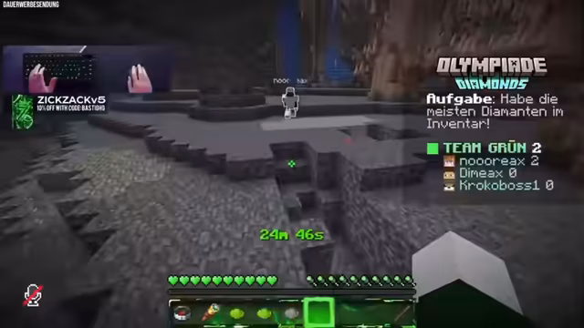 04:19:57Während des Spiels findet Team Grün, insbesondere Spieler Noreax, große Diamantenvorkommen in großen Höhlen und sammelt 24 Diamanten in kurzer Zeit. Team Blau leistet ebenfalls starke Arbeit und sammelt Diamanten. Teams konkurren intensiv um die Führung, wobei jeder Spieler einen Teil zum Teamerfolg beitragen muss. Emotionen steigen, als die ersten Diamanten gefunden werden.