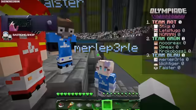 02:45:06Die Teams kämpfen um die wertvollen Goldblöcke in den Nether-Bastionen. Team Blau macht mit Merle einen herausragenden Job, eine Bastion mit 144 Punkten zu looten. Team Rot holt mit Hugo ebenfalls eine große Bastion, während Team Grün versucht, mit Dima nachzuziehen. Jedes gesammelte Goldstück ist entscheidend und Teams verfolgen unterschiedliche Strategien, um das Maximum herauszuholen, während sie darauf achten, nicht zu sterben und ihren Gold-Vorrät zu verlieren.