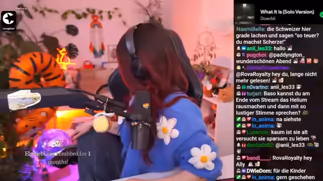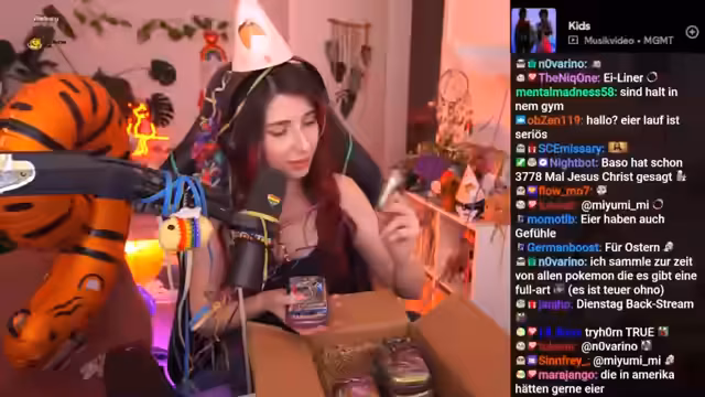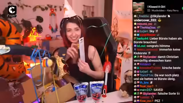 04:40:41Es wird die neunjährige Twitch-Partnerschaft gefeiert, während die Streamerin von Geschenken überwältigt wird. Eine Konfetti-Kanone sorgt für unfähige Versuche und allgemeine Belustigung. Die Community schickt Mehl, und es wird überlegt, was mit einer Bürste auf der Stirn angestellt werden kann. Die Streamerin zeigt Tricks und jongliert mit Gegenständen auf der Stirn. Ein Candy Lipstick weckt Erinnerungen an die 90er-Jahre, zusammen mit Kaugummi-Zigaretten. Die Streamerin erhält viele Sub-Gifts und wird reichlich mit Süßigkeiten und Snacks versorgt, darunter Esspapier, Katzenzungen und ein graues Viereck. Die Streamerin freut sich über ein Kissen mit dem Gesicht von Roloff und plant, es als Sitzkissen im Stream zu verwenden. Ein kleiner Partygast legt sich auf die Tastatur und verkleinert den Chat.