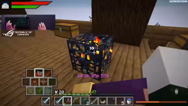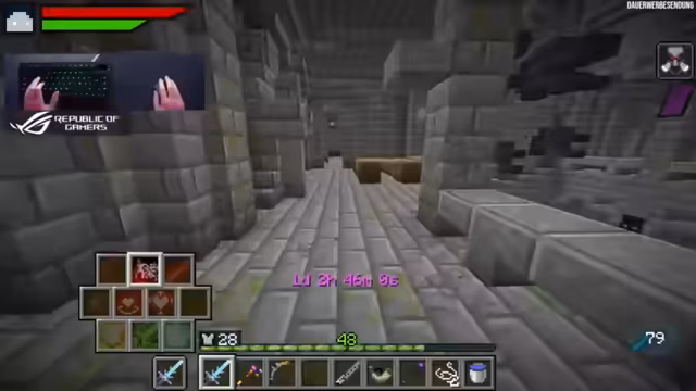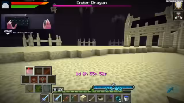 02:17:24Nachdem das Portal zum Ende gefunden wurde, stößt der Streamer auf eine veränderte Umgebung mit Endcrystals in einer Kathedrale. Der Enddrachen ist neuerdings immun gegen Zauber und kann sich nur besiegen lassen, wenn zunächst alle Kristalle zerstört werden. Der Kampf gestaltet sich besonders herausfordernd, der Streamer verliert viel HP durch fehlende Stamina, aber letztendlich besiegt er den Drachen und erhält wertvolle Drops wie Dragon Skin und Spell Book Upgrades.