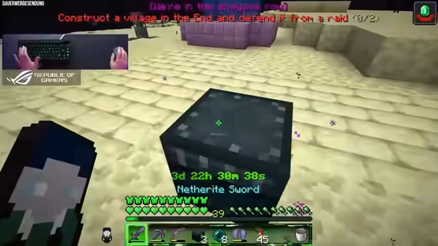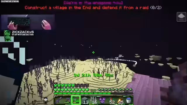 00:21:35Nach einer kurzen Pause wird das erste Achievement des Streams erläutert. Die Aufgabe besteht darin, ein Dorf im Ende zu bauen und dort einen Raid erfolgreich zu überleben oder abzuwehren. Der Streamer plant ein einfaches, aber funktionalles Dorf mit Villager, Bett und Arbeitsplatz. Er sammelt dazu Ressourcen wie Purpurblöcke, Endstein und Glas und beginnt mit dem Bau des ersten Hauses in verschiedenen Stilen.