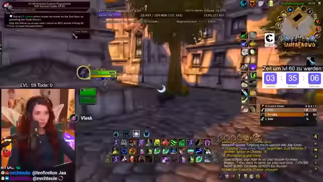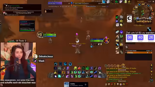 06:07:08Es ist die Endphase des Grinds, und der Streamer ist optimistisch, Level 60 noch zu erreichen. Er führt durch eine Serie von Quest-Abgaben, die jeweils 6000 XP bringen. Das Inventar wird geraumt, um Platz für die letzten Questgegenstände zu schaffen. Der Weg führt nach Eisenschmiede und Sturmwind, um Rohstoffe abzugeben, und das Zeitlimit von etwa 3 Stunden 40 Minuten ist immer noch im grünen Bereich.