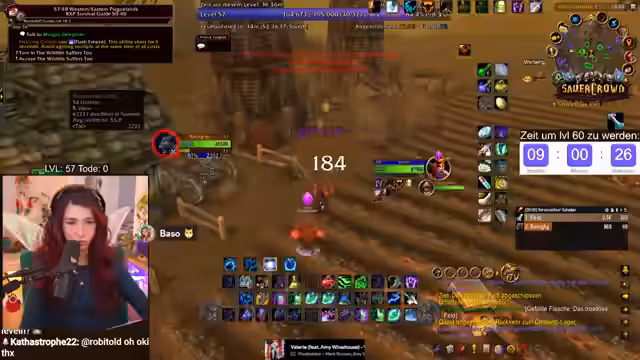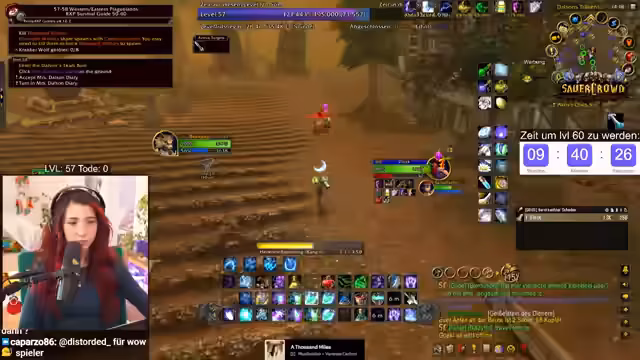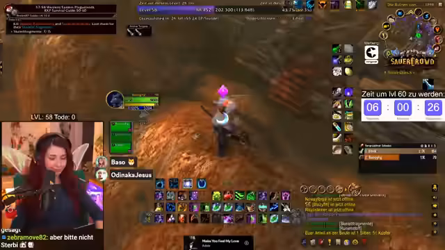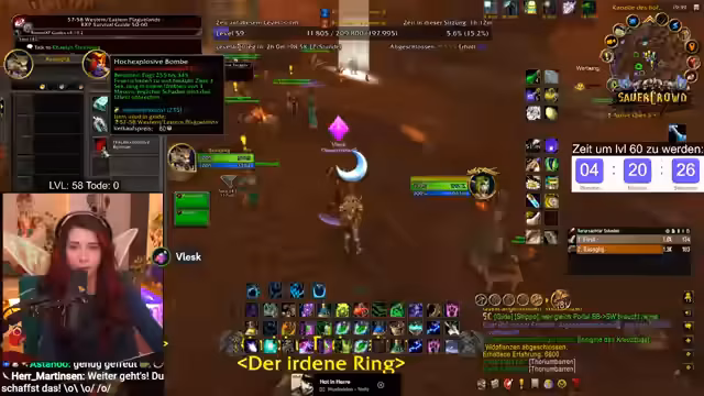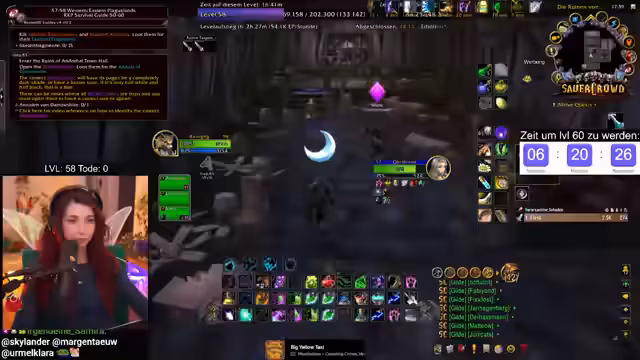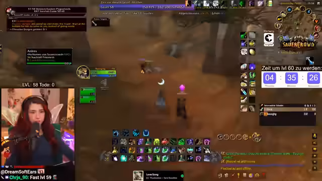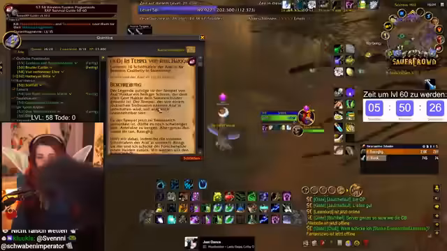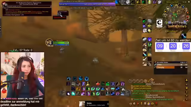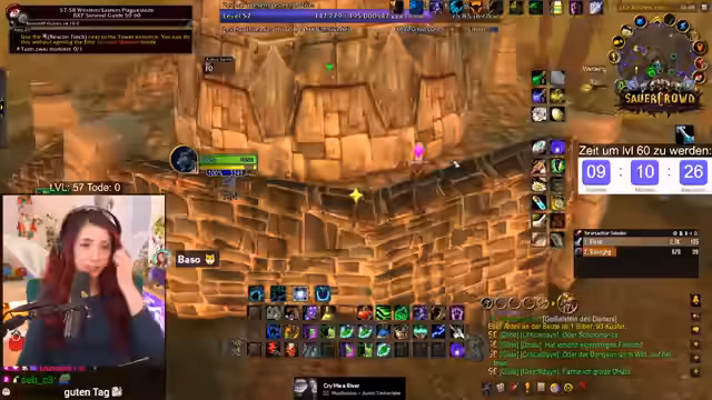 09:55:11Die verbleibende Erfahrung zum Erreichen von Level 60 ist knapp kalkuliert. Noch ausstehende Quests wie die Abgabe von Woll- und Rußstoff sowie zwei Quests in Darnassus werden benötigt, um die benötigten EP von 297.400 zu erreichen. Der Zeitdruck ist immens, was zu stressigen Situationen führt, wie dem Sammeln weiterer Geiselsteine. Der Streamer bleibt trotz des Drucks gelassen und betont, es sei nur ein Spiel.