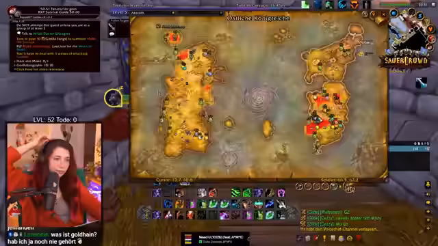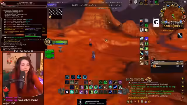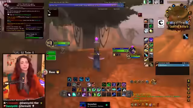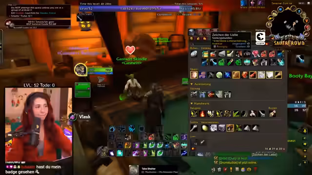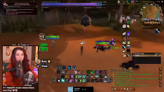 00:33:47Nach den anfänglichen Gesprächen und Community-Interaktionen wechselt Baso zurück ins Gameplay von World of Warcraft. Mit seinem Level 53 Charakter will er die verbleibenden Level bis 60 erreichen. Er erwähnt, dass er an diesem Tag möglicherweise wieder sehr spät streamt, was durch den hohen Grind-Druck verstärkt wird. Er freut sich auf das gemeinsame Leveln mit Vlesk und startet seine Quests im Gebiet von Booty Bay, wobei er auch auf die aktuelle Valentinstags-Event-Quest eingeht.