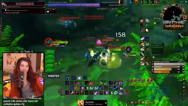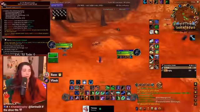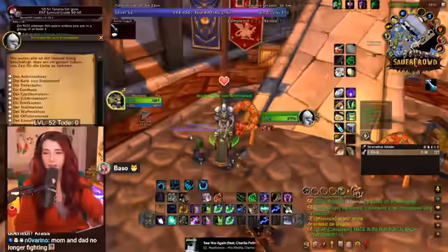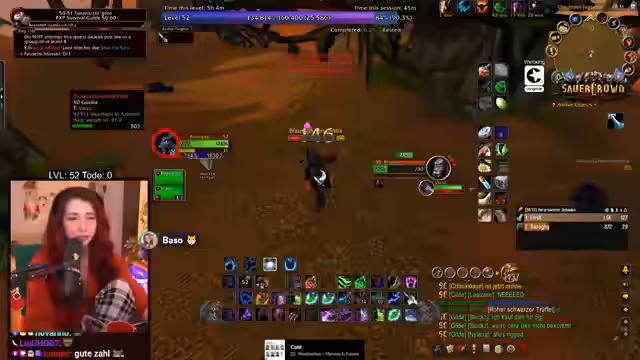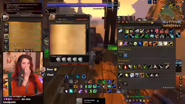 00:47:20Baso erfährt im Discord von einem tragischen Vorfall. Ein Gildenmitglied namens Lilly, eine Heilerin, ist kurz vor dem Erreichen von Level 60 gestorben. Nachdem ein Hunter-Pet versehentlich eine große Gruppe von Mobs angezogen hatte, flüchtete die Gruppe. Da Lilly die fliehenden Gruppe heilte, zog sie deren Aggro auf sich. Eine ungewöhnliche Spielmechanik in WoW, bei der Mobs auch von oben schlagen können, führte zu ihrem sofortigen Tod. Baso zeigt große Anteilnahme und kann den Clip des Todes nicht ansehen, da er selbst mitweint und die Tragweite für die verlorene Zeit und das verpasste Raid-Event empfindet.