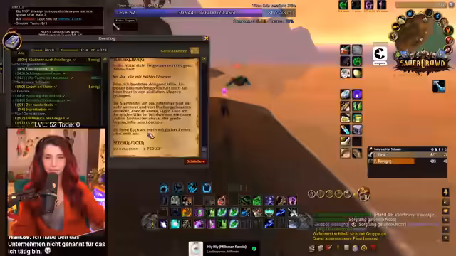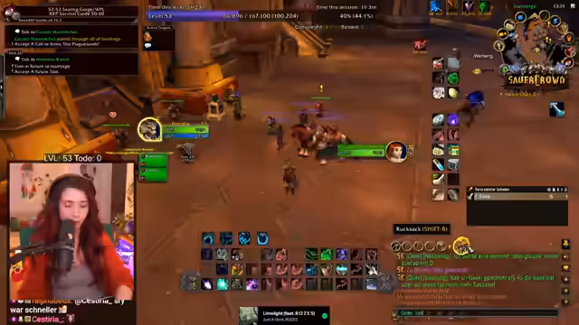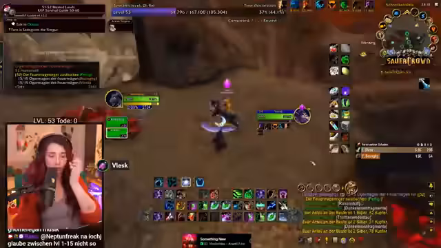 02:56:34Der Stream deutet den nahenden Endspurt zum Level 60 an. Er nutzt Gelegenheiten, um schneller Erfahrungspunkte zu sammeln, wie das wiederholte Annehmen einer Quest, die 5000 XP bringt, und farmt Gegenstände, die einen kleinen Stärke-, Beweglichkeits- und Ausdauerbonus bieten. Der Streamer stellt fest, dass es nur noch wenige Level bis zum Ziel sind und rühmt die Unterstützung im Chat. Ein Teilnehmer im Chat erreicht ebenfalls Level 60, was im Spiel mit einer Benachrichtigung quittiert wird. Es wird diskutiert, ob man als Zweit-Level-60-Spieler etwas Besonderes plant, was der Streamer zunächst verneint.