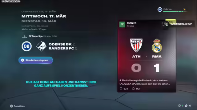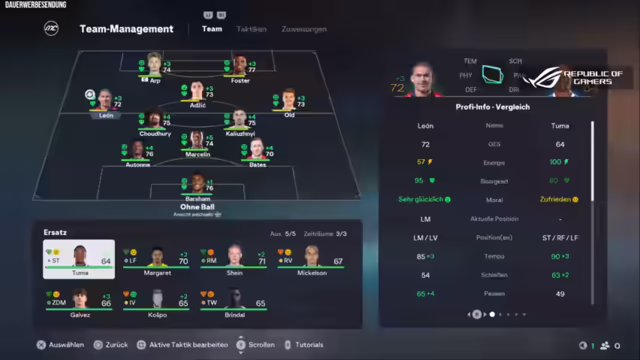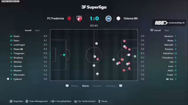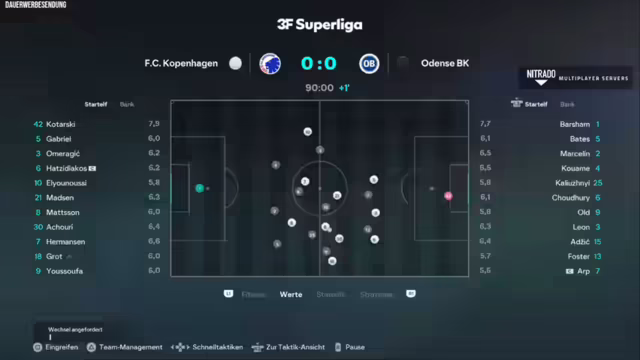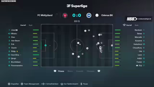 05:51:49Die Abwehr agiert passiv und steht tief. Es wird auf ein früheres Spiel verwiesen, in dem eine ähnliche Situation zu einem Torerfolg führte. Trotz viel Ballbesitz gelingt es nicht, in den ersten 45 Minuten einen Treffer zu erzielen. Eine Weltklasse-Parade des Torwarts verhindert den Rückstand. Der Streamer betont die Notwendigkeit einer Führung und verbleibenden 20 Minuten Spielzeit. Erwähnt wird, dass am Ende alles vom Spiel gegen Midtjylland abhängen wird. Nach einer Kombination und einer guten Idee fällt auf, dass das Team hellblau statt grau spielt, was für Verwunderung sorgt. Es wird festgestellt, dass auch Midtjylland unentschieden gespielt hat, was die Situation verbessert. Der Streamer überlegt, Foster aufgrund seiner Leistung zu verpflichten. Die Bedeutung des Spiels gegen Kopenhagen wird hervorgehoben, und es wird erwähnt, dass Midtjylland gewonnen hat, wodurch der Abstand auf den dritten Platz sinkt. Der Streamer analysiert die taktische Ausrichtung des Gegners und passt seine eigene Taktik an, indem er den Fokus auf den Angriff legt und die Außenverteidiger offensiver einsetzt. Eine unfassbare Parade des gegnerischen Torwarts wird erwähnt, und die Abwehr klärt ohne Probleme.