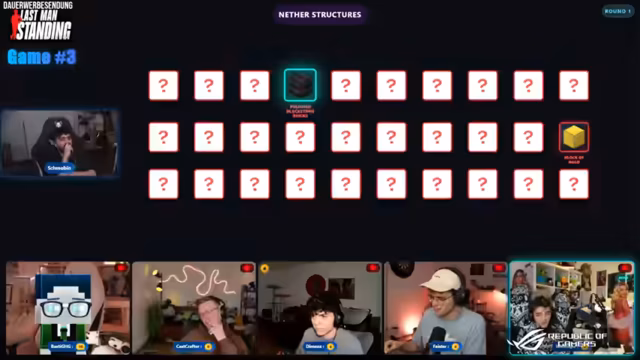 Bei einem Ratespiel mussten Teams verschiedene Minecraft-Objekte und Themen bewerten. Am Ende konnte ein Sieg verzeichnet werden. Zeitgleich wurde das Finale der '111 custom achievements' gemeistert, indem vier starke Bosskreaturen im End besiegt wurden.