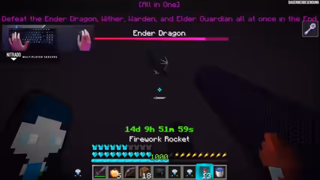 05:03:29Der eigentliche Kampf beginnt mit dem Enderdrachen, dem ersten der vier Bosse. Der Streamer tötet ihn systematisch, wobei der Warden noch in seinem Gefängnis wartet. Nach dem Drachen wird der Wither gespawnt und eliminiert. Die Herausforderung besteht darin, alle Bosse ohne eigene Verluste innerhalb der Zeitvorgabe zu besiegen und dabei den Warden am Leben zu halten.