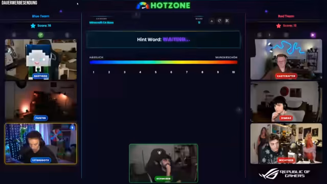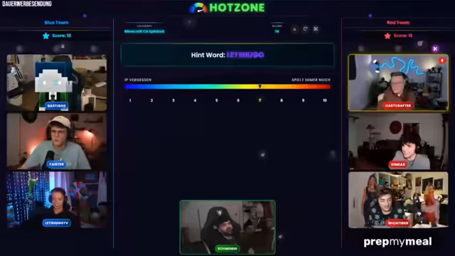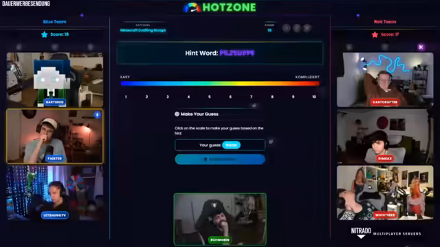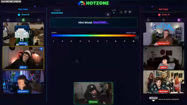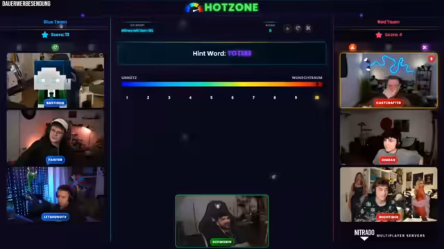 00:43:54Das Quiz beginnt mit Team Blau. Der erste Spieler erhält eine Kategorie, wie "Minecraft-Item", und muss ein Wort vorgeben, das die Skala von "wegwerfen" bis "in die Enderchest packen" beschreibt. Sein Team muss daraufhin eine Zahl zwischen 1 und 10 raten. Die Teams diskutieren intensiv über die richtige Einordnung, nutzen Strategien und Joker, um ihre Chancen zu maximieren und Punkte zu sichern oder Minuspunkte zu vermeiden.