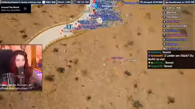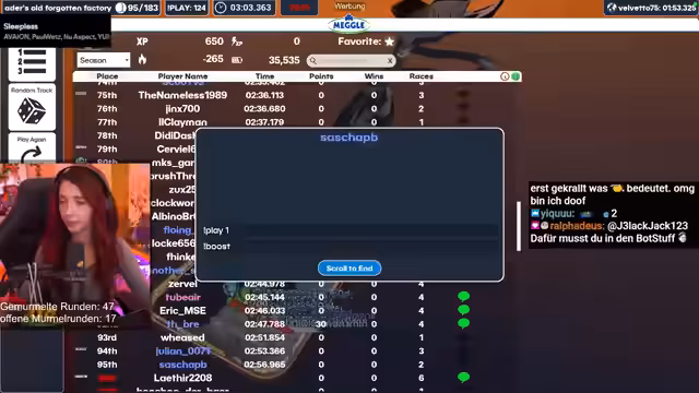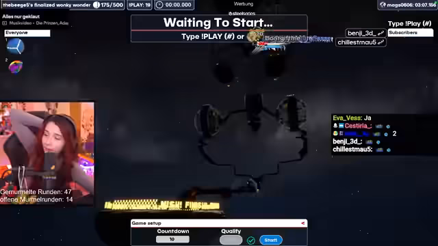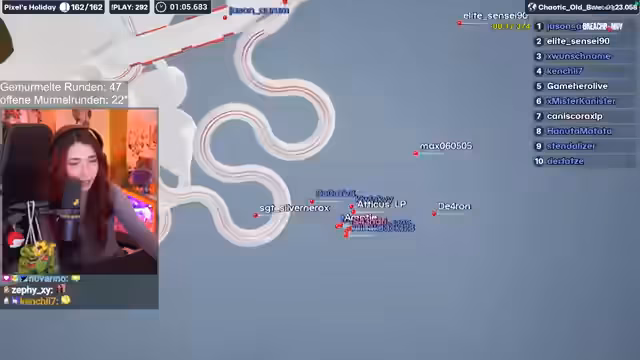 02:20:05Der Stream ist erneut von einem Murmel-Rennen geprägt, bei dem die immense Größe der Karte die Übersicht erschwert. Während des Spiels kommt es zu einem unerwarteten musikalischen Zwischenfall, als ein Schlagersong in der eigentlich als „Banger-Playlist“ angepriesenen Musikliste auftaucht. Die Streamerin zeigt sich irritiert über die Stilabweichung und überlegt, den Song zu entfernen. Trotz des musikalischen Durcheinanders geht das Murmel-Rennen weiter, begleitet von der Diskussion über die Regeln, insbesondere die Konsequenzen für den letzten Platz. Es wird deutlich, dass die Murmel-Runden nicht nur für Unterhaltung sorgen, sondern auch für Spannung und das Risiko eines temporären Banns.