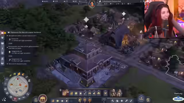 09:15:47Die Streamerin bemerkt, dass sie im Forschungsbaum von Anno 117 keine weiteren Optionen mehr hat, nachdem sie die Toiletten erforscht hat. Sie überlegt, ob sie als Nächstes die Spinnerei erforschen sollte, die einen Wissensbereichseffekt bietet, oder die Lagerhäuser, die Arbeitskräfte und Instandhaltungskosten reduzieren. Sie entscheidet sich für die Lagerhäuser, da dies eine gute Investition zu sein scheint. Während des Spiels kommt es zu öffentlichen Unruhen, die sie überraschen, da ihre Bevölkerung eigentlich zufrieden ist. Sie stellt fest, dass die Polizei zu weit entfernt ist, um schnell eingreifen zu können, und muss ein Lösegeld von 11.000 bezahlen, um einen Angriff der Skathach-Krieger abzuwenden. Kurz darauf kommt es zu einem unerwarteten kurzen Internetausfall, der den Stream kurz unterbricht, aber schnell behoben werden kann, ohne dass der Stream neu starten muss.
