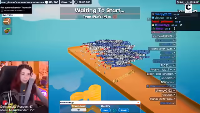 02:14:52Ein Teilnehmer der letzten Runde, Jinx 700, wurde gebannt, fühlt sich aber 'gescampt', da andere nicht gebannt wurden. Der Streamer bietet an, solchen Bannwünschen auch außerhalb des Spiels nachzukommen. Um die Verwirrung über die Map-Auswertung aufzuklären, wird angekündigt, die Runde noch einmal zu spielen, um das ungewöhnliche Ziel, bei dem Murmeln zurückrollen können, zu erklären und so den Spielmechanismus transparenter zu machen.