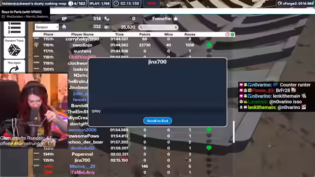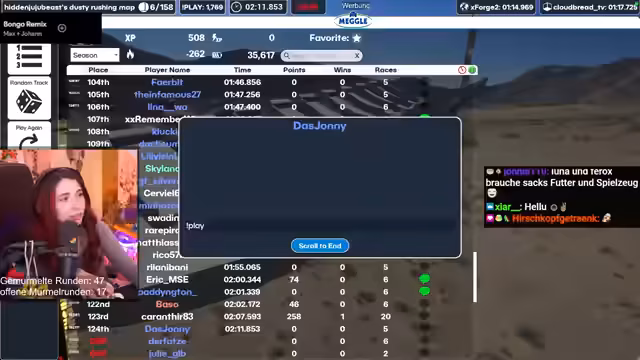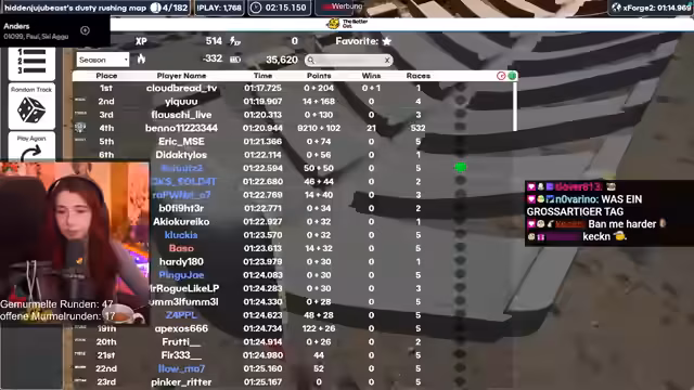 01:56:08Die Streamerin äußert erneut ihr Unverständnis über die Begrenzung der VIP-Rollen auf 50 Plätze auf Twitch und fragt sich, ob dies dazu dient, den VIP-Status exklusiv zu halten. Sie möchte lieber weiter Murmeln spielen als ein Songbattle zu starten. Es wird diskutiert, ob mehr Zuschauer im Chat zu mehr VIP-Abzeichen führen könnten, was sich als zutreffend, aber bereits an der Obergrenze befindlich herausstellt. Die Streamerin bedauert, dass sie keine weiteren VIP-Plätze freischalten kann und würde sogar Geld an Twitch zahlen, um dieses Problem zu lösen. Sie muss weiterhin inaktive VIPs entfernen, um Platz für neue Gewinner zu schaffen. Eine neue Map mit 1700 Plays wird ausgewählt, die einen riesigen Fall beinhaltet und Schwindelfreiheit erfordert. Die Chat-Namen der Teilnehmer sorgen für Heiterkeit.
