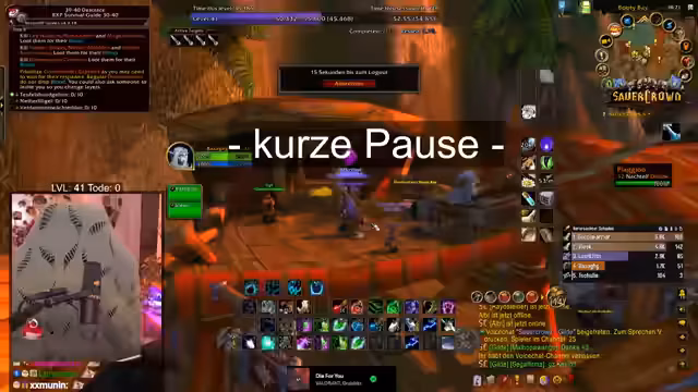 12:20:57Nach über 12 Stunden Streaming gibt der Streamer seinen bevorstehenden Ausloggen bekannt. Er kündigt an, am Wochenende frei zu haben, und plant, am nächsten Dienstag wieder in WoW einzusteigen, um gemeinsam mit den Zuschauern das Level 60 zu erreichen. Er beendet den Stream mit einem finalen Raid zu Noah, um diesem zu helfen, und verabschiedet sich von der Community, die nächsten Dienstag wieder im Stream begrüßt werden soll.