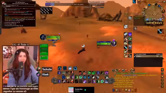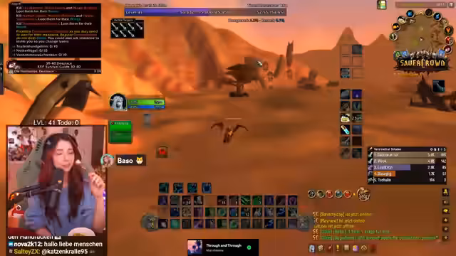 04:10:17In Desolace stellt der Streamer fest, dass die Landschaft ungewohnt ist, aber ihm gefällt sie besser als das Sumpfgebiet von zuvor. Es kommt zu einem kurzen Vorfall mit einem Elite-Riesen im Wasser, den er für einen Quest-Mob hält. Während des Streams probiert er verschiedene lustige Emotes und Ideen aus, wie etwa einen 'scuffed Haarsalon' auf einer geplanten Kaktus-Convention. Der Stream endet damit, dass er seine Ziele für das Leveling klar definiert hat und mit der Gruppe weiter questen wird.