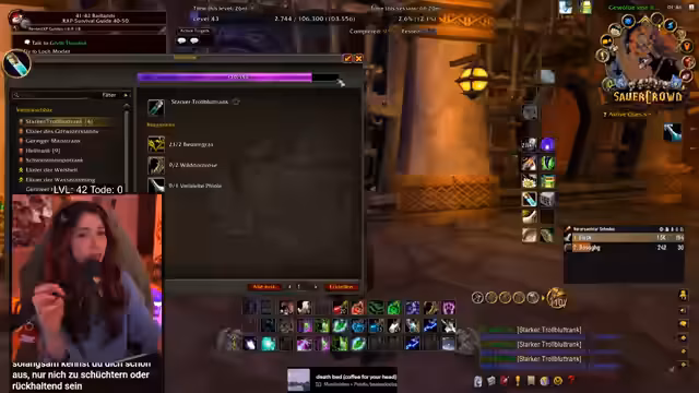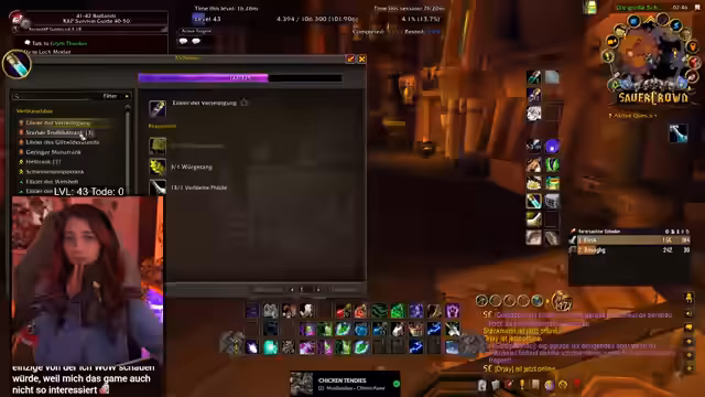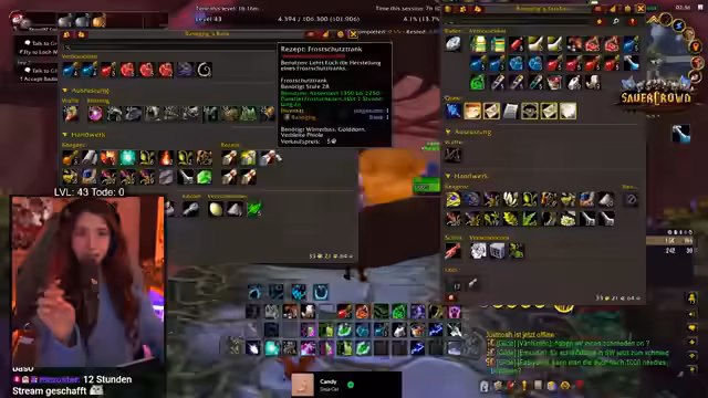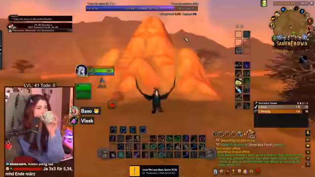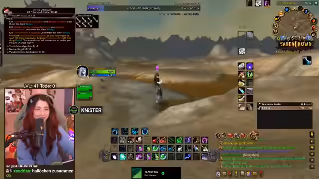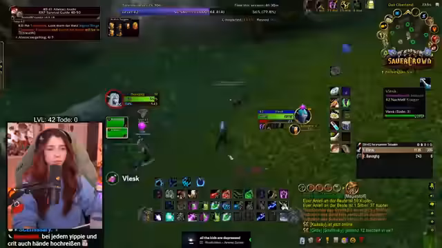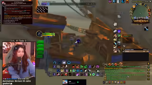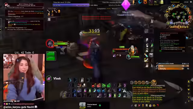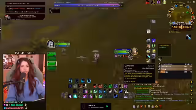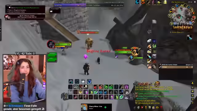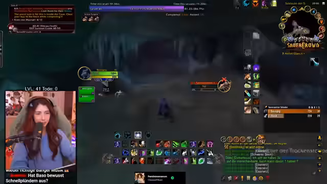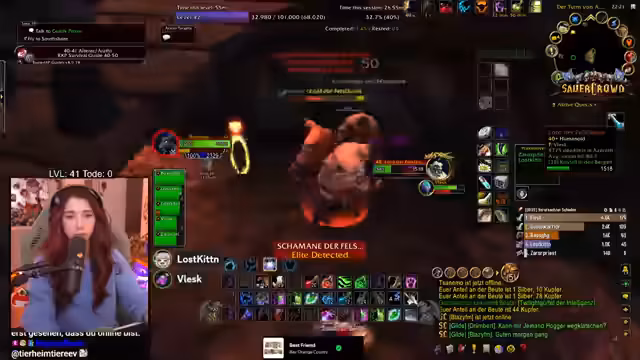 06:00:15Der Streamer und sein Begleiter farmen in einer Höhle Kobolde für eine Quest, wobei sie die Ressourcen wie Eisenerz und Silberbarren teilen. Der Streamer ist in seiner Katzenform in der Höhle und merkt, dass sie deprimierend schnell geleert ist, da viele auf dem Layer farmen. Sie erreichen Level 42 und erfreuen sich über Glückwünsche aus dem Chat. Anschließend planen sie, die World Buffs für eine kommende Elite-Quest aufzusparen.