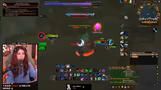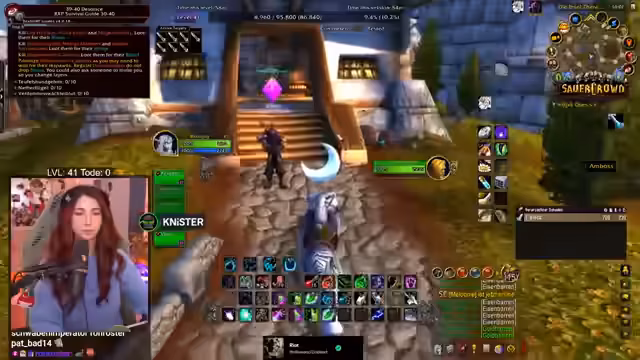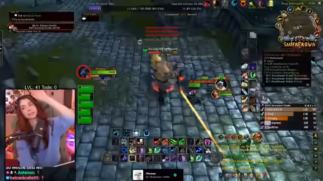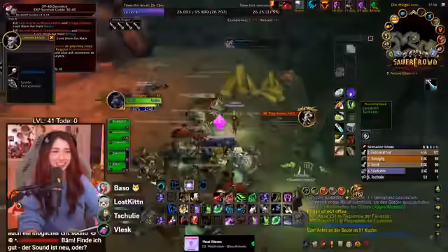 08:30:46Der Stream konzentriert sich auf das Abschließen verbleibender Quests, insbesondere das Looten von vier spezifischen Gegenständen. Ein prominentes Ereignis ist der Kampf gegen einen Enforcer, der den Streamer mit der Fähigkeit Intimidation (Furcht) belegt, was als besonders frech und ärgerlich empfunden wird. Die Kämpfe werden strategisch gestaltet, um einen erneuten Pull von Gegnern zu vermeiden. Ein Addon, das bei Crits über 300 Damage einen Yippie-Sound ausgibt, sorgt für regelmäßige Reaktionen im Chat und bei den Spielern.