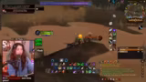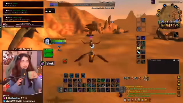 04:01:19Nach der kurzen Pause ist der Streamer zurück und startet in Desolace mit dem Questing. Er fliegt zunächst von Booty Bay nach Ratchet und anschließend nach Desolace. Während des Flugs erzählt er eine lustige Anekdote, bei der er vom Boot gesprungen ist, weil Kitten zurückgeblieben war, und stellt fest, dass es ein emotionaler, nicht logischer Schritt war. Er erwähnt auch, wie er im Dungeon Items wie ein Drachen-Clown-Ring gefunden hat, den er für den Verkauf vorgesehen hat.