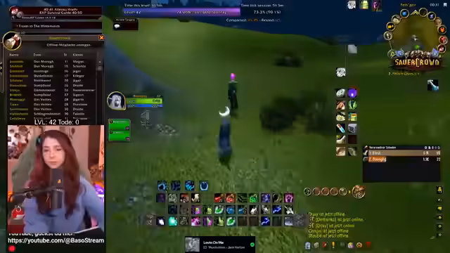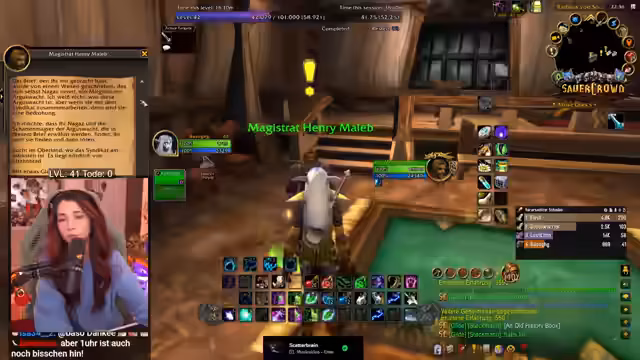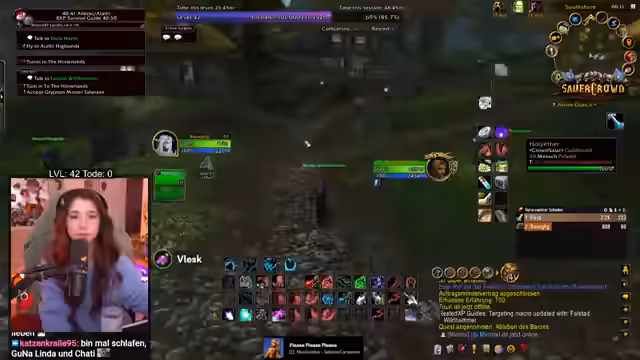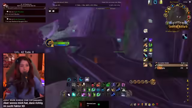 06:59:17Nach einem stressigen Teil optimiert der Streamer seinen Questlog und bereinigt verwaiste Quests. Sein Begleiter erreicht ebenfalls Level 42. Sie planen, weitere Quests im Außen- und Innenbereich zu erledigen sowie einiger Abzeichen zu farmen. Der Streamer merkt an, dass er mit dem Mount schneller ist als mit seiner Reisegestalt und fühlt sich ungewohnt. Sie entscheiden, gemeinsam die mobs zu töten und Proquests für eine schwierigere Quest zu holen.