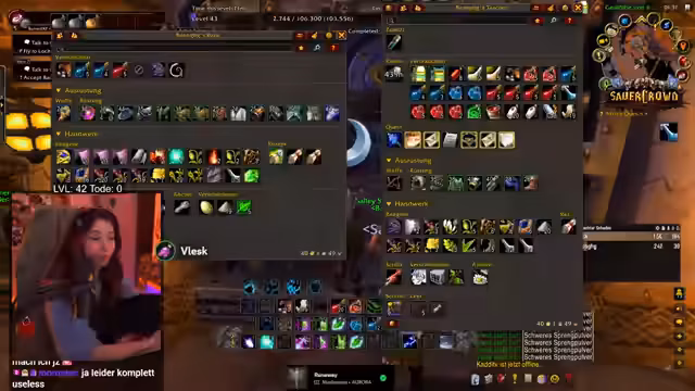 04:25:21Der Streamer klagt über den extrem begrenzten Inventarplatz in World of Warcraft und sucht aktiv nach Möglichkeiten, ihn zu erweitern. Er bittet im Chat um Hilfe und zeigt sich dankbar für den Vorschlag, ein paar Taschen abzugeben. Die Suche führt ihn und seine Mitspieler nach Desolace, wobei die Lage und der Weg zur Ortung von Taschen genauer erörtert werden. Es ist eine Phase, die stark von der Notwendigkeit geprägt ist, das Inventar effizient zu verwalten, um weiter questen und farmen zu können.