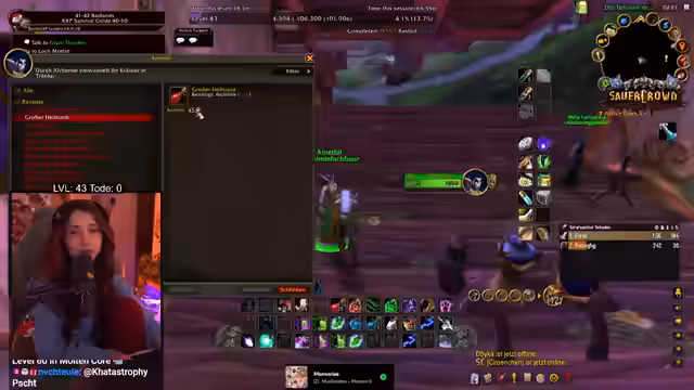 04:52:17Nachdem die Gruppe in Desolace erfolgreich Taschen erhalten hat, gibt der Streamer sein langjähriges Problem des vollen Inventars auf. Durch den Austausch von kleineren Taschen gegen größere und effizienteres Management des Inventars hat er nun deutlich mehr Platz. Mit dieser neuen Freiheit plant er nun, sein Rest-XP Level weiterzusteigen und zielt auf Level 43 ab. Die nächsten Schritte beinhalten das Abschließen von Quests und das Abdecken von Empfehlungen des 'Rested'-Guides.