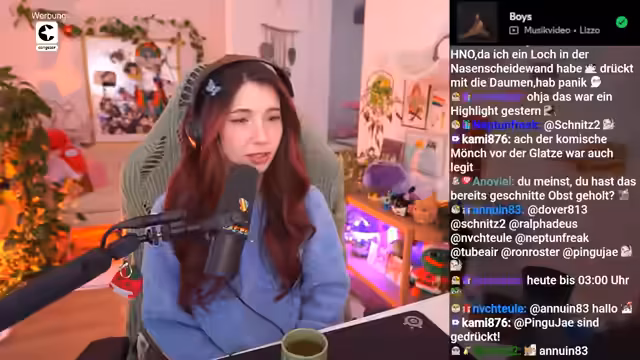 05:22:49Zwischen den Ingame-Aktivitäten tauchen immer wieder persönliche und alltägliche Themen auf. Der Streamer isst einen Kinder-Bueno-Riegel und kommentiert dessen krümeliges Verhalten. Auch sein neues Aussehen, inklusive Glatze und Hals-Tattoos, ist ein Thema der Diskussion im Chat. Zuschauer geben ihm Komplimente und er äußert sich über seine aktuelle Verfassung, fühlt sich aufgrund vieler Stunden am Schreibtisch müde, obwohl er Cola trinkt.