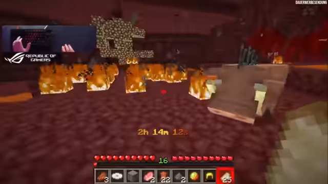 02:11:12Der Streamer stellt fest, dass er genug Essen gesammelt hat und nun beginnen muss, an Ressourcen für den Kampf gegen den Wither zu arbeiten. Er hat Blaze Powder von Blazes, Magma Cream von Magma Cubes und Gunpowder, aus denen er theoretisch Fire Charges herstellen könnte, um die Hoglins effizienter zu braten und sich vor Kreaturen zu verteidigen. Gleichzeitig spricht er über seine Pläne für zukünftige Streams und erwähnt seine Vorbereitungen für ein Formel-1-Spiel.