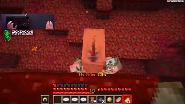 00:44:52Nachdem der Streamer einen geeigneten Spawn im Nether gefunden hat, beginnt er sofort mit der Challenge. Er stellt schnell fest, dass er in einer gefährlichen Umgebung mit Lava und anderen Gefahren ist. Ohne Zugang zu normalen Ressourcen wie Holz oder Gold hat er nur die Drops von Monstern als Quelle für Items. Die ersten Kreaturen, denen er begegnet, sind Hoglins, von denen er Fleisch zum Überleben benötigt, aber auch deren Kampf ist gefährlich.
