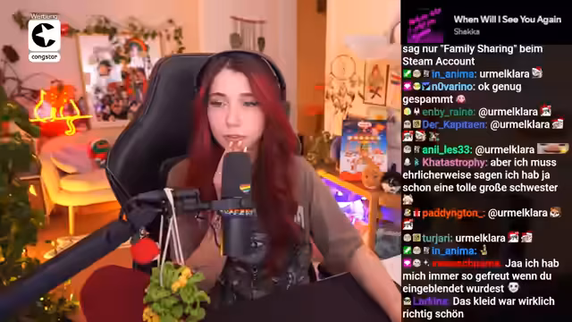 00:55:34Die Streamerin reagiert auf Sub-Gifts (u.a. 50 subs von Jona) und erwähnt eine organisierte Watch-Party im Discord-Off-Chat, die die Community ohne offizielle Anleitung durchführte. Sie zeigt sich gerührt von dieser Eigeninitiative und kommentiert, dass das gemeinsame Veranstaltungserlebnis im Stream anders als vor Ort sei, aber dennoch wertvolle Momente bot. Auch das neue Discord-Bot-System für Watch-Parties wird positiv hervorgehoben.