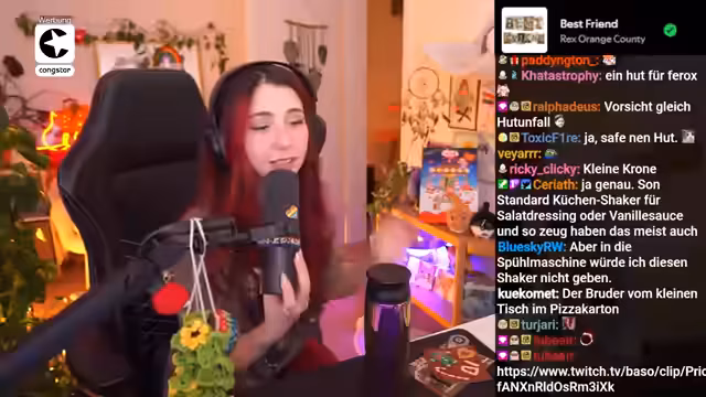 06:04:36Es werden Details zur Haarfarbe und -pflege geteilt. Der Streamer färbt seine Haare mit einer selbst gekauften roten Farbe von Maria Nila nach, da die Behandlung beim Friseur zu teuer ist und nicht zur Zufriedenheit führte. Der Prozess wird als schnell und unkompliziert beschrieben. Im Hintergrund interagiert die Katze Ferox, die versucht, auf den Schoß zu kommen und Aufmerksamkeit zu erregen. Dies führt zu einer Pause im Spiel, da der Streamer die süße Katze kraulen möchte. Es wird auch erläutert, dass Gerüche in Katzenhaushauptsächlich vom Katzenklo stammen und nicht von den Tieren selbst, vorausgesetzt, die Pflege ist angemessen.