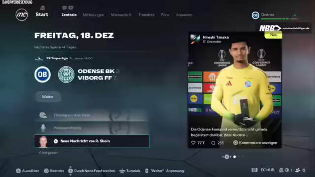 04:01:54Der Streamer analysiert den Kalender und die Tabellensituation in der Liga, wo das Team nur vier Punkte hinter dem ersten Platz liegt. Er freut sich über die Entwicklung von Vasily. Nach dem Spiel gegen Bröndby, wird das Spiel gegen Pauka thematisiert. Der Streamer lobt das Spiel gegen Bröndby und die herausgespielten Chancen. Er ist zufrieden mit der Leistung des Teams, auch gegen starke Gegner wie Bröndby. Der Streamer lobt einzelne Spieler wie Leon Frey, der seit seinem Einsatz im Innenraum eine Torgarantie ist. Er freut sich darüber, dass kein Spieler mehr unter 70 im Rating liegt. Nach dem 2:0 Sieg, betont der Streamer die Wichtigkeit des Sieges und die Tatsache, dass Midtjylland Punkte liegen lässt. Er plant, die nächste Simulation mit der aktuellen Taktik durchzuführen, da sie momentan gut funktioniert. Vor dem Spiel gegen Paar Flenker, betont der Streamer die Wichtigkeit von drei Punkten oder zumindest einem Unentschieden. Er analysiert die gegnerische Aufstellung und überlegt, auf Konter umzustellen. Nach dem 1:0 durch Leon, lobt der Streamer die Laufwege und die Pasicherheit des Teams. Er betont die Wichtigkeit des Sieges und die Auswirkungen auf die Conference League Tabelle. Der Streamer freut sich über ein Jobangebot von ist dann schon wieder. Der Streamer betont, dass die Transferphase bald beginnt und er bereits Spieler im Kopf hat. Nach dem 1:0 Sieg im Rückspiel, steht das Team im Halbfinale des Pokals. Der Streamer betont die Dominanz im Rückspiel und freut sich über den Einzug ins Halbfinale. Gegner im Halbfinale ist Kopenhagen.