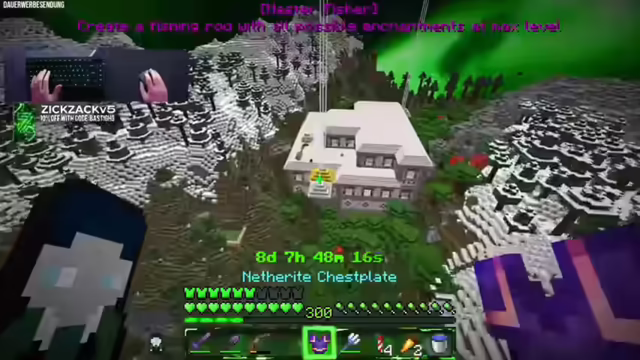 01:50:13Die Zuschauer äußern sich positiv über die Shirts. Der Streamer sammelt weitere Banner in einem Dorf, in dem er bereits Raids gespielt hat und erklärt, dass er die Banner immer platziert und nicht wegwirft. Er äußert Verständnis für Zuschauer, denen es schwerfällt, Villager in Farmen leiden zu lassen, betont aber, dass er durch seinen Job dazu gezwungen ist, Ironfarmen zu bauen. Er kündigt an, dass er in dem aktuellen Raid noch mehr Banner finden wird. Er schließt ein weiteres Achievement ab, indem er 16 Banner sammelt. Als nächstes steht das Achievement 'Masterfischer' an, bei dem eine Angel mit allen möglichen Verzauberungen auf maximalem Level erstellt werden muss. Er stellt fest, dass er Level 300 erreicht hat und nun die Möglichkeit hat, ein Full Enchantment durchzuführen. Dafür angelt er erstmal nach einem Mending Buch, um die Angel zu reparieren.