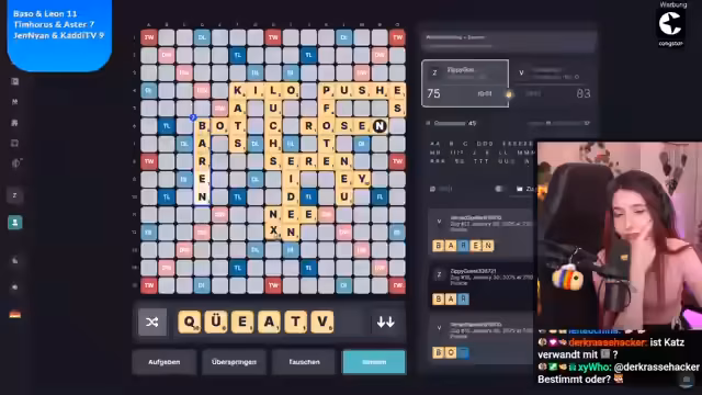 03:59:08Es beginnt ein intensives Scrabble-Duell, bei dem die Teilnehmenden versuchen, möglichst viele Punkte zu erzielen. Es werden verschiedene Strategien angewendet, wie zum Beispiel das Legen von Wörtern auf Bonusfelder oder das Blockieren von gegnerischen Zügen. Es gibt jedoch auch Herausforderungen, wie zum Beispiel das Ziehen von ungünstigen Buchstaben oder das Finden von passenden Wörtern. Die Teilnehmenden kommentieren ihre Züge und tauschen sich über ihre Überlegungen aus. Es kommt zu überraschenden Wendungen, wie zum Beispiel dem Legen von unerwarteten Wörtern oder dem Blockieren von gegnerischen Plänen. Die Stimmung ist angespannt und konzentriert, während die Teilnehmenden versuchen, das Beste aus ihren Buchstaben zu machen und ihre Strategien umzusetzen. Es wird deutlich, dass Scrabble nicht nur ein Glücksspiel ist, sondern auch strategisches Denken und ein gutes Vokabular erfordert. Auch der Chat wird miteinbezogen und es wird sich für die Unterstützung bedankt. Trotz des Wettbewerbs steht der Spaß am Spiel im Vordergrund.