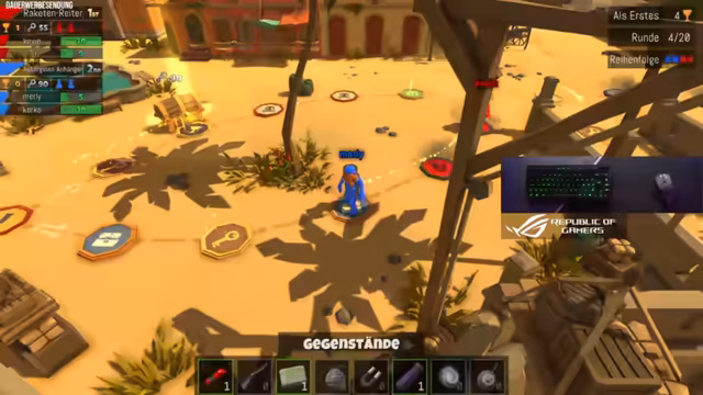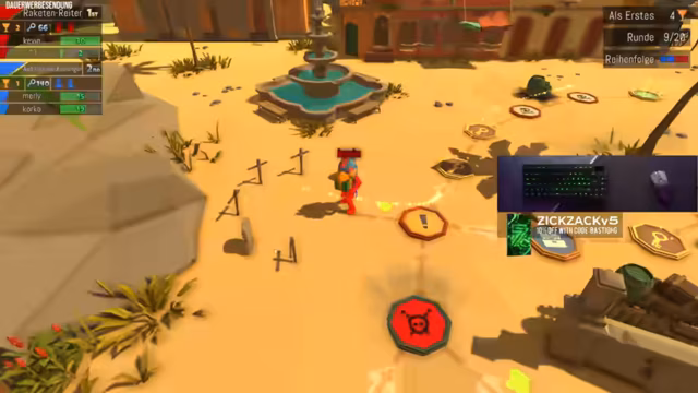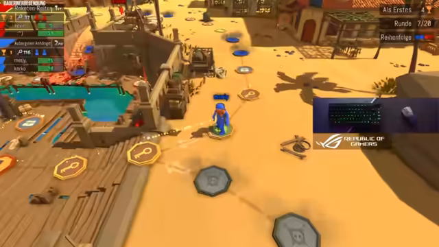 03:19:08Es wird überlegt, wie man Merle klein halten kann, um den eigenen Vorteil zu sichern. Basti zieht eine taktische Kaktusverkleidung an, um sich vor Angriffen zu schützen. Es wird überlegt, wann und wie Items eingesetzt werden sollen, um den größten Nutzen zu erzielen. Es wird über die Reichweite von Items diskutiert. Es folgt ein Minispiel, bei dem mit Teleportern geworfen werden muss. Es wird über die Strategie diskutiert und versucht, das Minispiel zu gewinnen, um an wichtige Items zu gelangen. Team Rot gewinnt das Minispiel und darf als erstes würfeln. Es wird überlegt, Merle anzugreifen, aber aufgrund ihres Kaktus-Schutzes verworfen. Stattdessen wird versucht, den zweiten Pokal zu holen.
