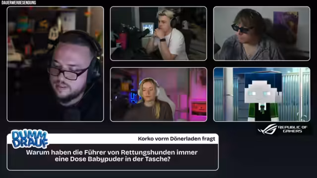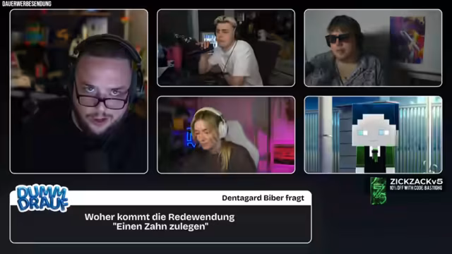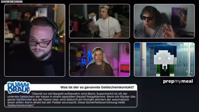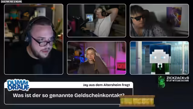 00:38:07Die Game Show beginnt mit einem Intro und der Begrüßung der Zuschauer. Dominik Rieksmann übernimmt die Moderation und lobt die Wortschöpfung 'Dumm drauf'. Das Team, bestehend aus Kevin, Kroko, Merle und Basti, wird vorgestellt. Jeder Teilnehmer präsentiert drei kurze Fakten über sich selbst: Kevin bezeichnet sich als dumm, verpeilt und geizig; Kroko gibt an, glückssüchtig und zweimal geschieden zu sein und keinen Kontakt zu seinen Kindern zu haben; Merle beschreibt sich als unemployed, sehr groß und schlecht in Videospielen; und Basti betont seine Fähigkeit, zwischen Wörtern und Fakten zu unterscheiden, seinen Schnurrbart, seine beweglichen Hüften und seine Freude auf den Stream. Anschließend wird das erste Rätsel von Jay aus dem Altersheim präsentiert: Was ist der sogenannte Geldscheinkontakt?