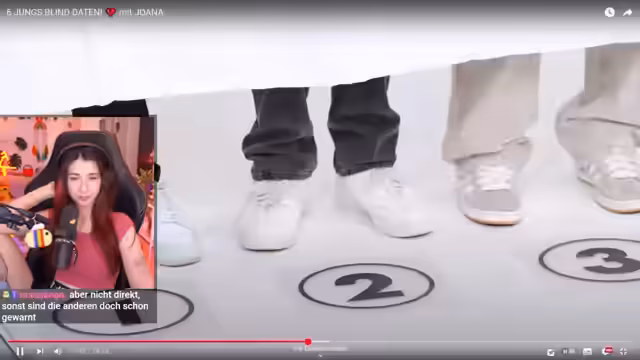 01:21:44Nach der Zusammenfassung des 'Gang & Friends'-Videos plant der Streamer das nächste Format. Es wird ein Blind-Dating-Video ausgewählt, das 24 Minuten dauert, und der Streamer bittet seine Community, ihn währenddesses nicht mit ablenkenden Kommentaren zu unterhalten. Das Video startet mit der Vorstellung der Kandidatin Joanna, die als sehr sportlich und mit einem unverkennbaren Lächeln beschrieben wird, und sechs männlichen Teilnehmern hinter einem Vorhang.