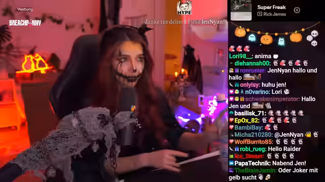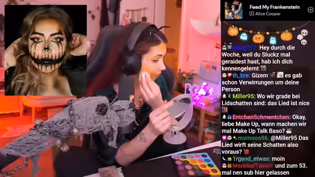 02:32:45Ein Chatkommentar, der suggeriert, dass andere weibliche Streamer weniger aktiv seien, ruft eine klare Reaktion hervor. Der Streamer betont, dass es hier keinen Wettbewerb gebe und man nicht durch Abwertung anderer Komplimente machen solle. Anschließend beginnt er mit einem improvisierten Halloween-Make-up, wobei er erläutert, dass er sich mit der Technik schwer tut, aber auf den Prozess 'vertrauen' müsse. Er bittet die Zuschauer ebenfalls, sich schminken zu lassen und ihre Ergebnisse im Discord zu teilen.